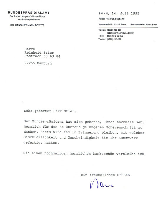 Datum: Dienstag, 26 November, 2002 um 12:14:15 Kommentar: Lieber Herr Stier, Ihr Auftritt als Scherenschneider zu unserem Sommerfest war mehr als gelungen und die begeisterten Reaktionen der Teilnehmer sprachen für sich. Sie waren eine künstlerische Bereicherung für unser Fest. Ihnen alles Gute für die Zukunft! Barbara Janssen