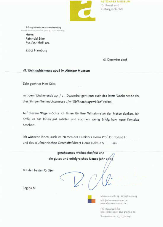 Datum: Dienstag, 26 November, 2002 um 09:53:17 Kommentar: Sehr geehrter Herr Stier, vielen Dank, dass Sie am 29. und 30. August 2002 anlässlich des Alstervergnügens in unserem Hause waren. Unsere Kunden und Mitarbeiter waren erstaunt und begeistert von Ihrer Scherenschnittkunst, die dazu beigetragen hat, dass dieser Abend lange in Erinnerung bleibt. Wir wünschen Ihnen beruflich und privat alles Gute. Dresdner Bank AG Marketingmanagement