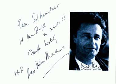 Wir waren am Ostersonntag 2003 auf dem Dom und waren ganz fasziniert von Ihrer Scherenschnittkunst und haben uns von Ihnen gleich einen Scherenschnitt anfertigen lassen. Er ist bei uns Zuhause (Wilhelmshaven)auch total super angekommen. Viel Erfolg weiterhin, Wünschen Ihnen Maike und Markus Plohr