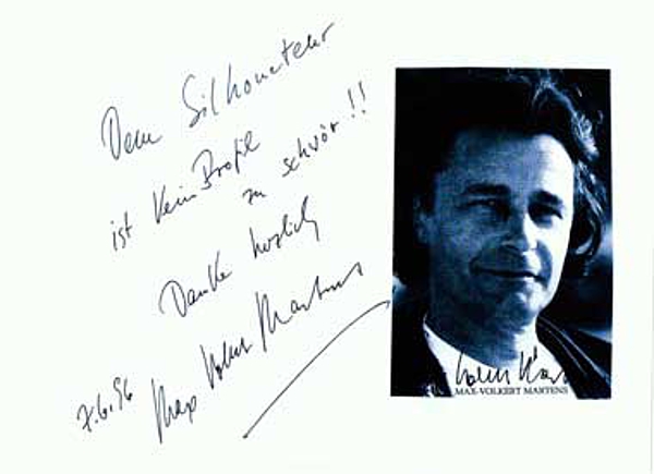 Nur Ihretwegen sind wir zum Dom gekommen. Als Sie nicht da waren, wollte ich schon gehen. Doch ich habe mich überreden lassen, zu warten und mir fast den Hintern abzufrieren (Ihr Kleister war ja auch schon eingefroren). Jetzt, mit Ihren wahrhaft schönen Scherenschnitte von meiner Liebsten und mir bin ich froh, dass ich diese Strapaze auf mich genommen habe. Vielen Dank und weiterhin viel Erfolg wünschen Ihnen Matthias Reichenbach & Astrid Baumgratz