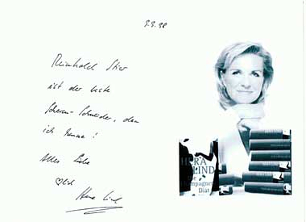 Hallo, lieber Reinhold! Wenn ich dich schon nicht in deinem Dom-Atelier besuchen kann, dann doch erstmal bei deinem Internet-Auftritt! Deine Scherenschnittkunst hat mich & #12539 überzeugt! Denn, dass selbst mein komischer "Kegelkopf" noch ausschneidenswert ist, finde ich gut. Seitdem hängt mein Scherenschnittporträt dekorativ umrahmt bei meinen Eltern an der Wohnzimmerwand über dem blauen Sofa. Das ist enorm, was du alles aus dem Stehgreif zaubern kannst ! Du kannst sogar Leute im Vorbeifahren im Dunkeln am Profil erkennen. Das ist für mich erstaunlich ! Du hast einfach einen scharfen Blick für das Wesentliche und auch noch eine Wunderschere. Ich wünsche dir weiterhin viel Erfolg damit ! Bis bald und tschüß ..., die Claudia